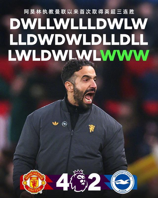 全场比赛结束,曼联主场4-2击败布莱顿,成功拿下阿莫林时期的首次英超3连胜,9轮积16分来到第4,距离19分的阿森纳仅差3分!